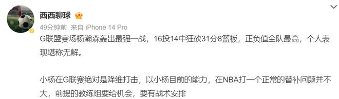 但有一位开拓者球迷写道:没用的,就算杨瀚森在G联赛拿到100分也没用,因为开拓者主帅斯普利特是一个低智商、愚蠢的主帅,他不会给杨瀚森机会的。